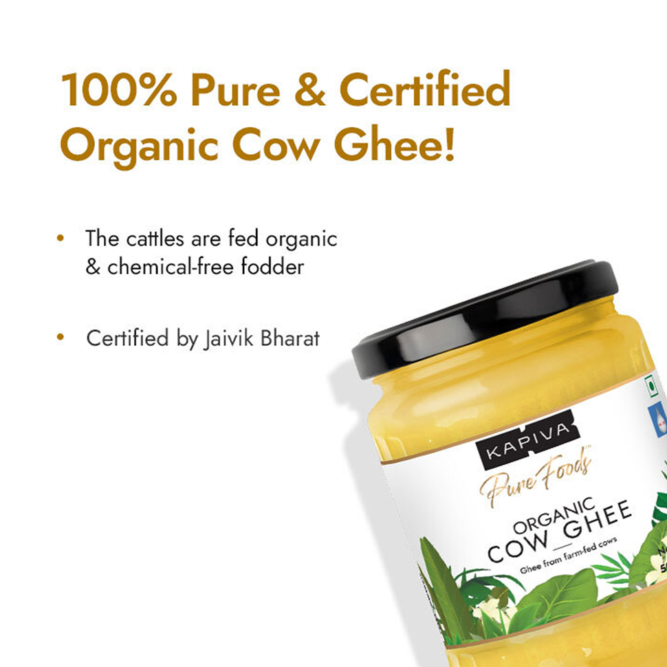 Kapiva Organic Ghee is made of cow milk and helps in holistic nutrition and well-being.