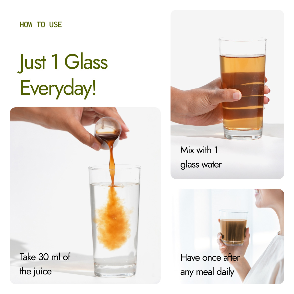 - Drink once after any meal everyday