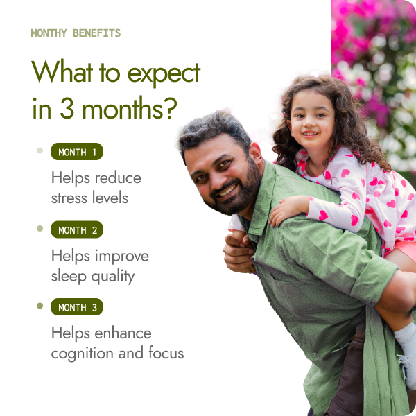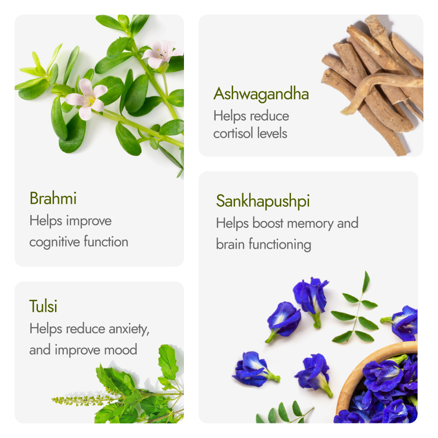 Our capsules are 100% Ayurvedic, made with root derived Ashwagandha & potent herbs like Brahmi, Tulsi, Mandukparni, Shankpushpi that helps manage stress, improve cognitive function and enhance focus by reducing cortisol levels naturally.