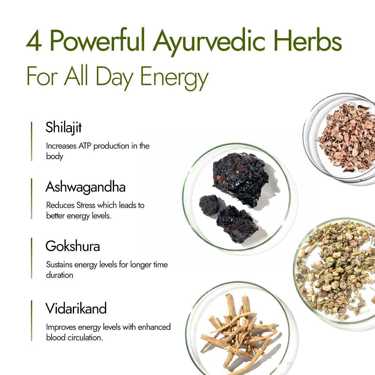 Shilajit enhances ATP production, which is the true source of cellular energy, helping you stay active and alert throughout the day. Ashwagandha supports balanced energy by reducing stress hormones, preventing energy crashes caused by stress.