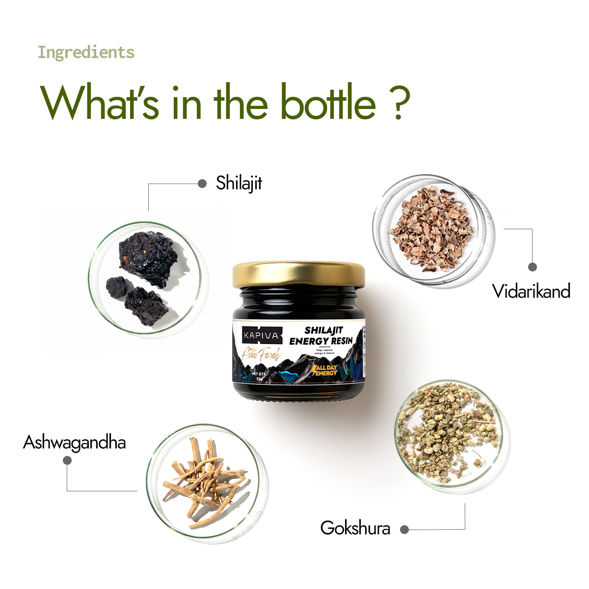 Kapiva Shilajit Energy Resin is a powerful blend of shilajit, ashwagandha, vidarikand, and gokshura designed to naturally boost and sustain your body's energy.