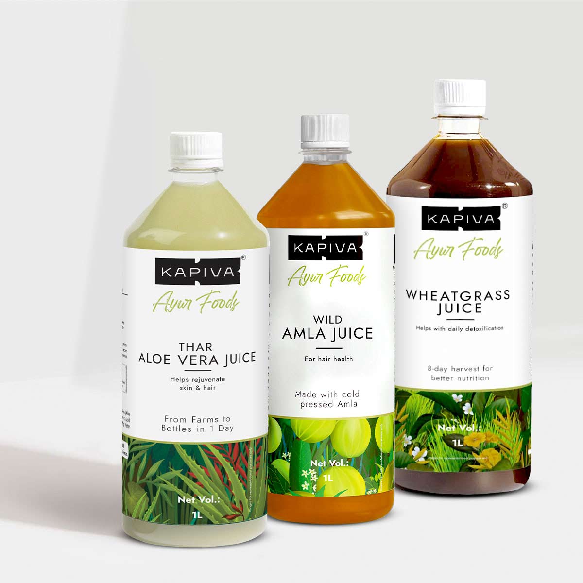Power up your immunity with the Kapiva Wholesome Wellness Combo consisting of Kapiva Wheatgrass Juice, Kapiva Aloe Vera Juice, and Kapiva Amla Juice. All the 3 products are power-packed with ingredients that help alleviate myriads of physical ailments. Wheatgrass juice boosts immunity and has anti-aging effects. Aloe Vera juice plays a prominent role in skincare, haircare, and liver functions. Amla juice enhances metabolism and strengthens your immune system. These herbal juices are a complete package for overall wellness.