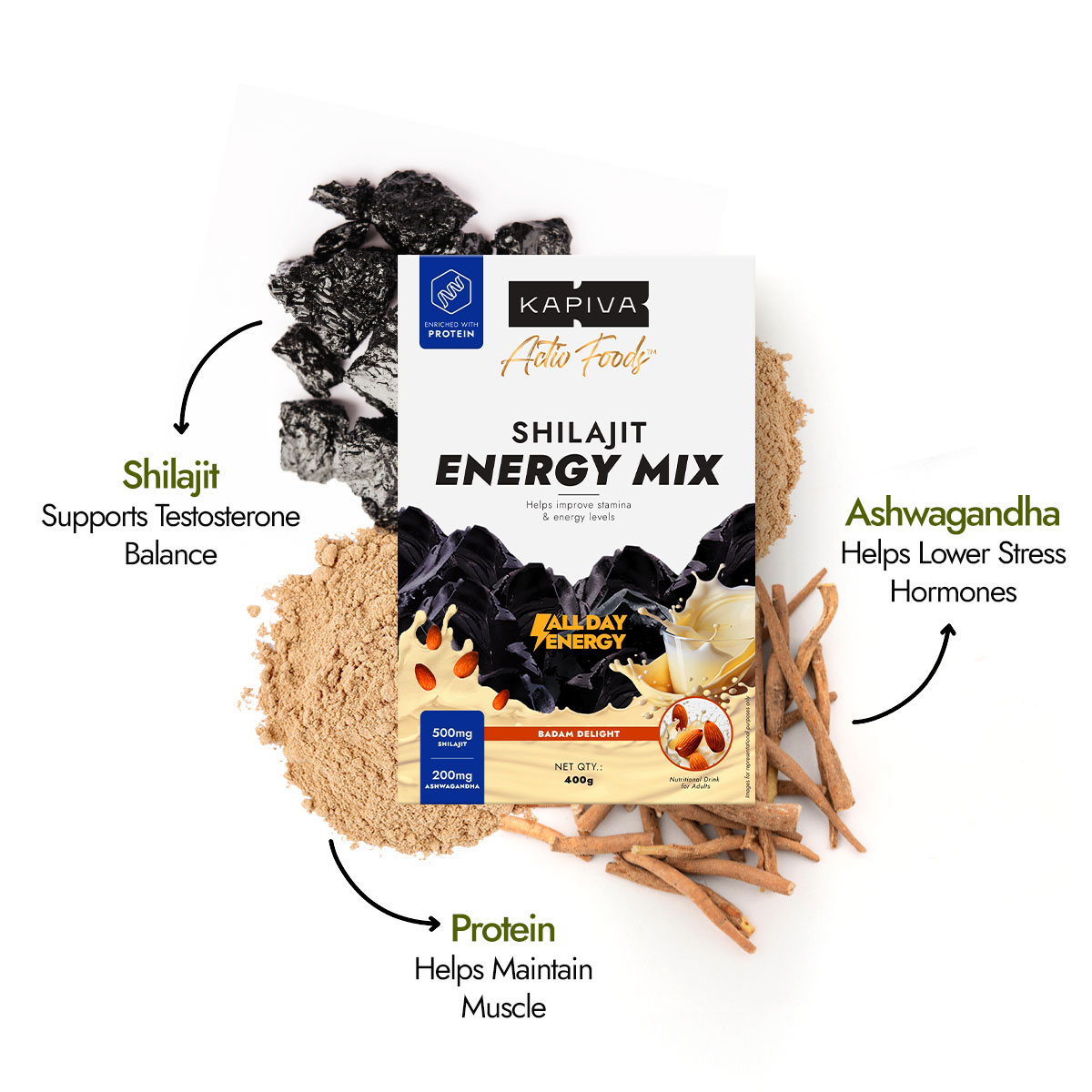 Kapiva Shilajit Energy Mix in Badam flavour is your daily dose of all-day energy. It is blended with Ashwagandha and protein-rich milk powder, and topped with almond slices, this mix improves energy and stamina, reduces stress, and promotes restful sleep—with every sip.