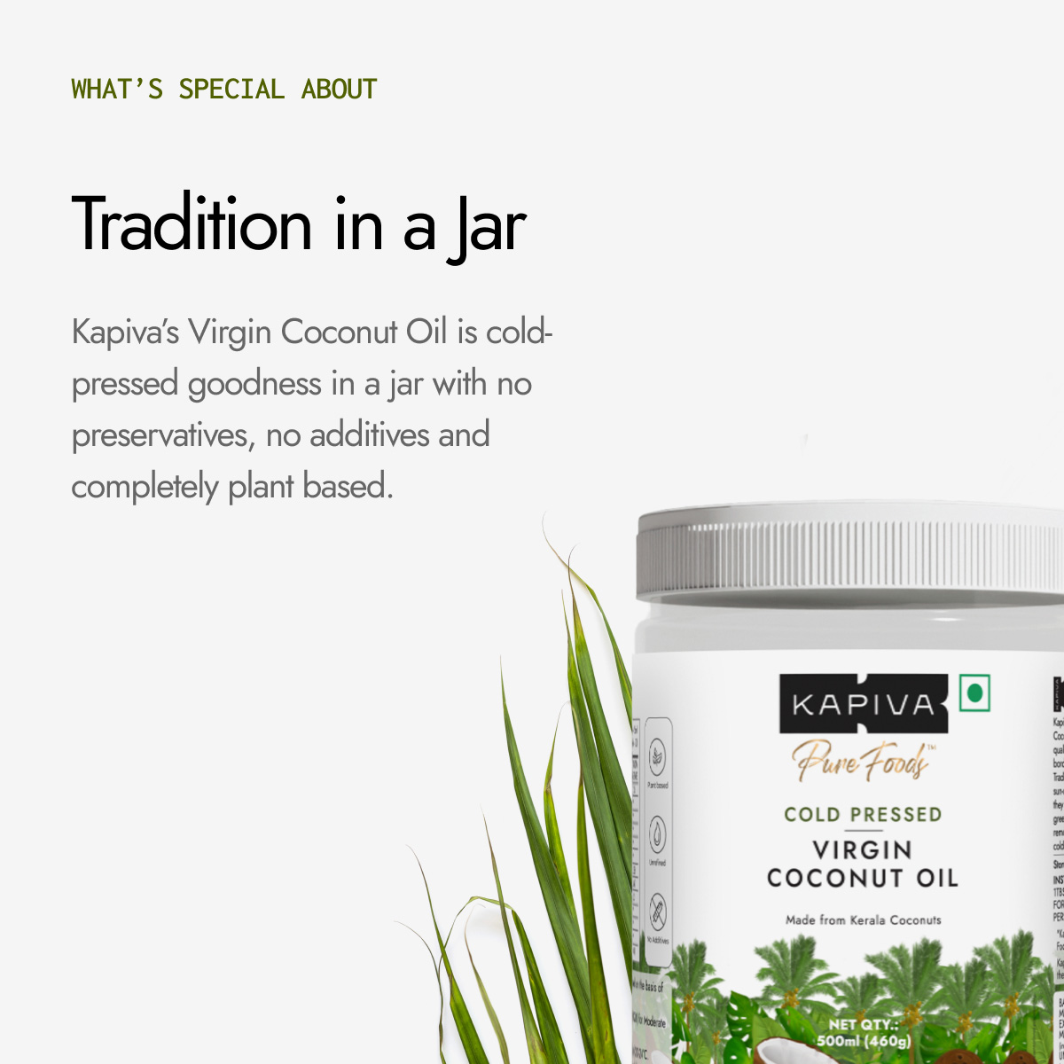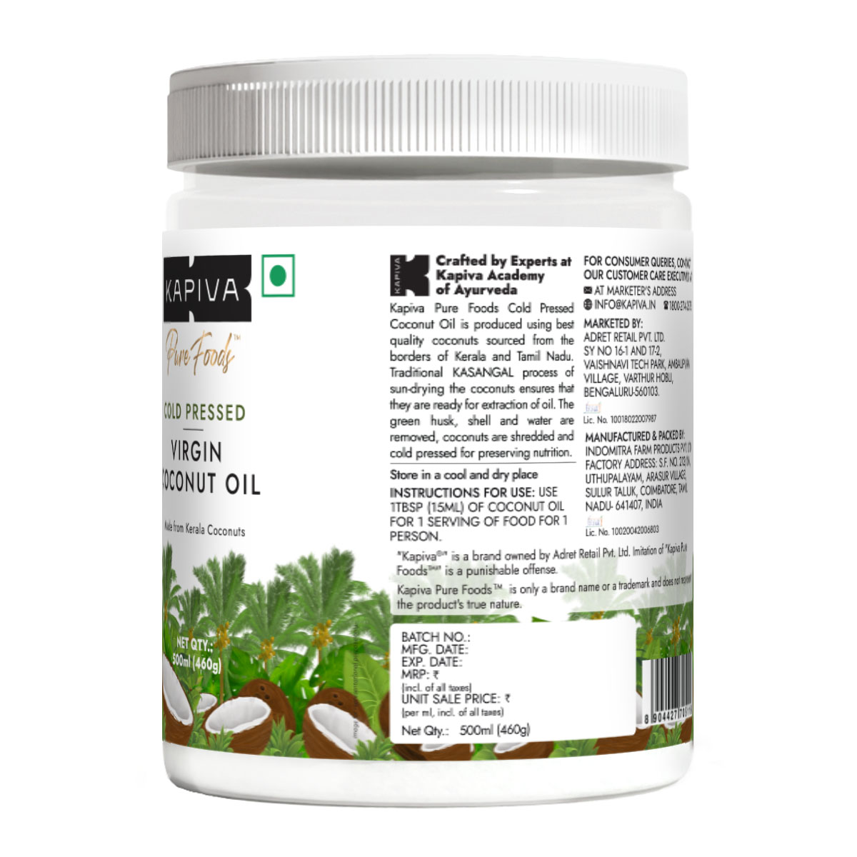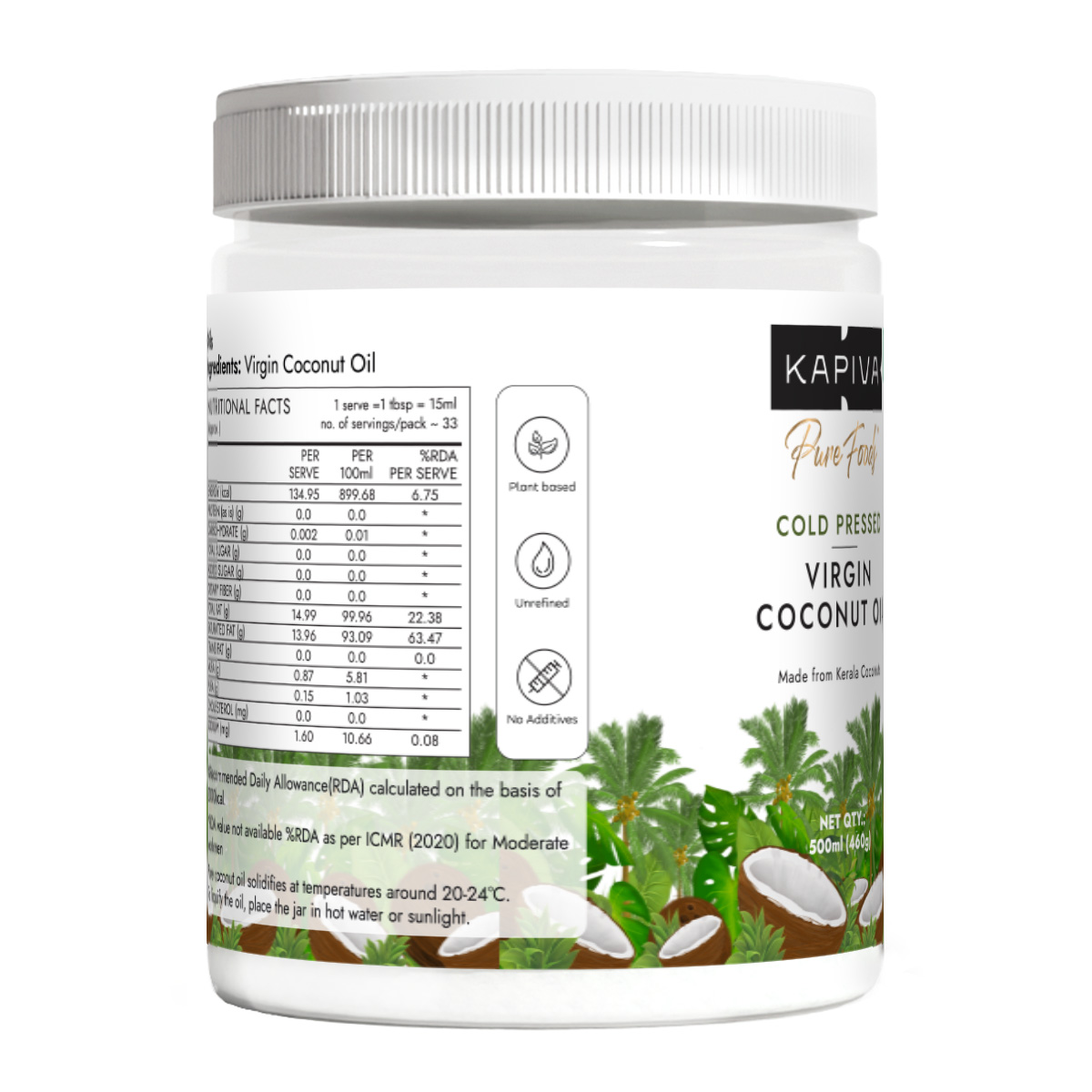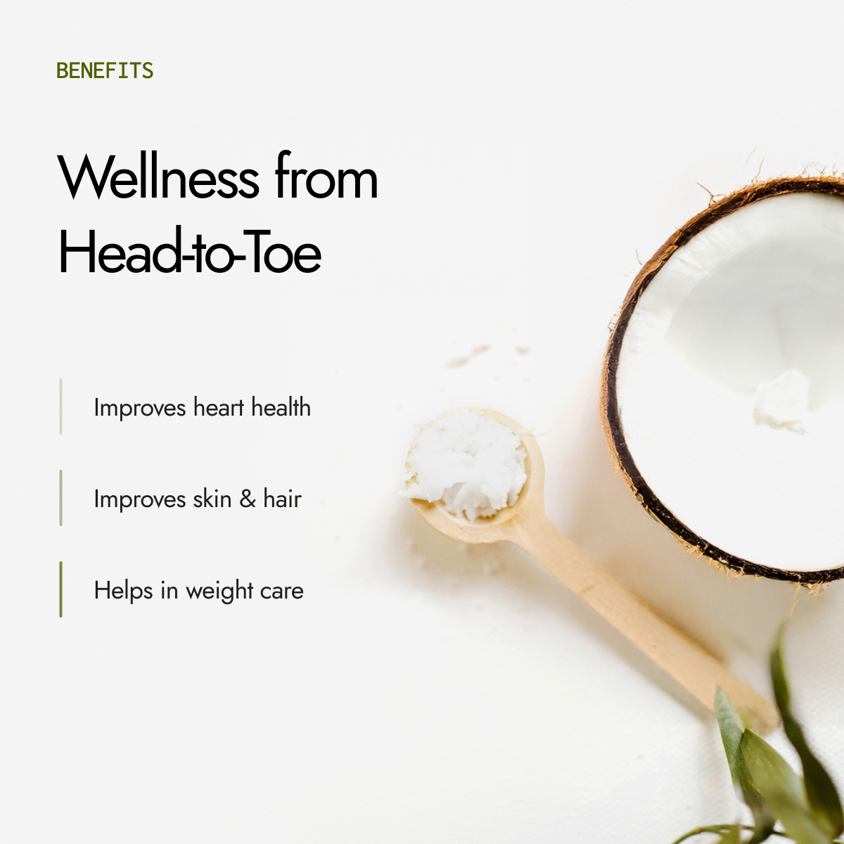 Our Virgin Coconut Oil is obtained from fresh white coconut meat from Kerala coconuts. We ensure it is made from Cold-Pressed technology that helps retain maximum nutrition. Unlike refined or processed oils, cold-pressed oils help reserve healthy antioxidants which otherwise get damaged when exposed to heat.