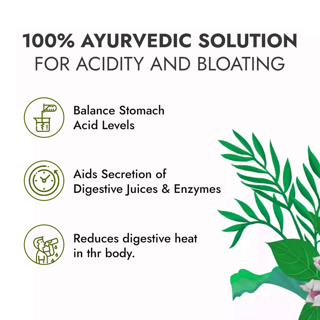Get long-term relief from acidity and bloating issues. Made from 5 Ayurvedic herbs- Amla, Jeera, Ajwain, Hing, and Dhania to treat the root cause.