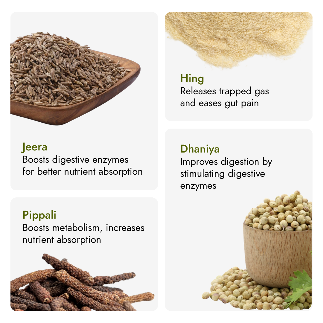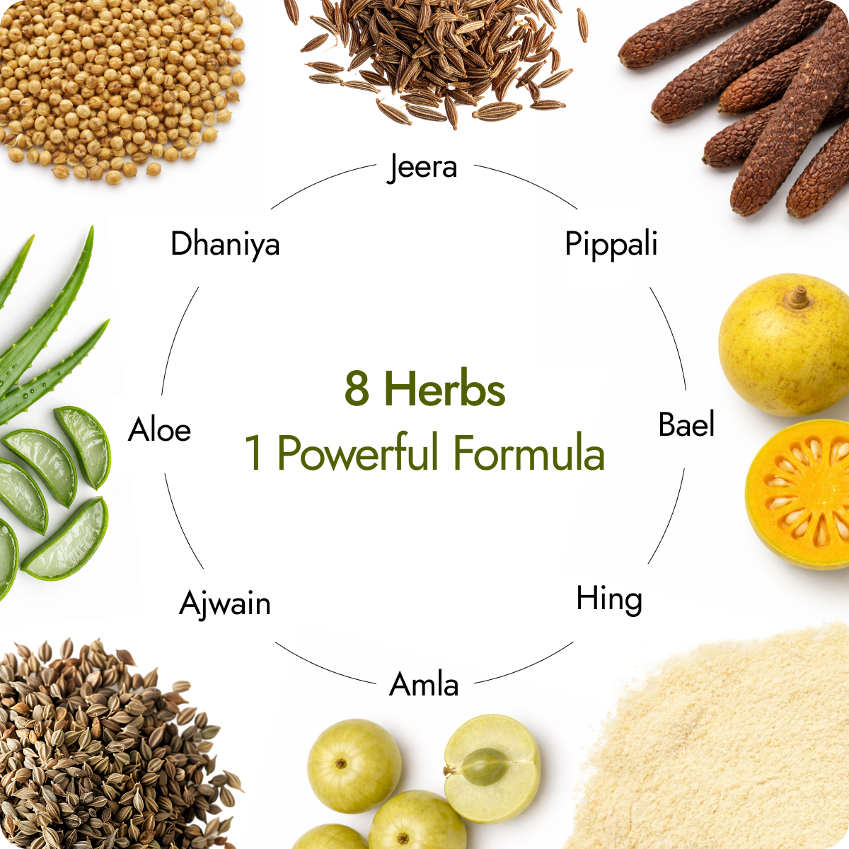 Get long-term relief from acidity and bloating issues. Made from 5 Ayurvedic herbs- Amla, Jeera, Ajwain, Hing, and Dhania to treat the root cause.